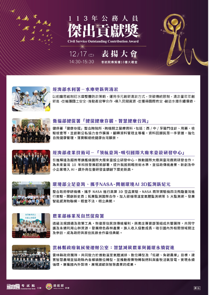 113年公務人員傑出貢獻獎業經考試院組成評審委員會評選出6名得獎人及6組得獎團體。為表揚得獎者傑出事蹟,考試院訂於113年12月17日(星期二)下午2時30分於考試院傳賢樓10樓大禮堂舉行表揚大會,並同步於銓敘部臉書進行線上直播。