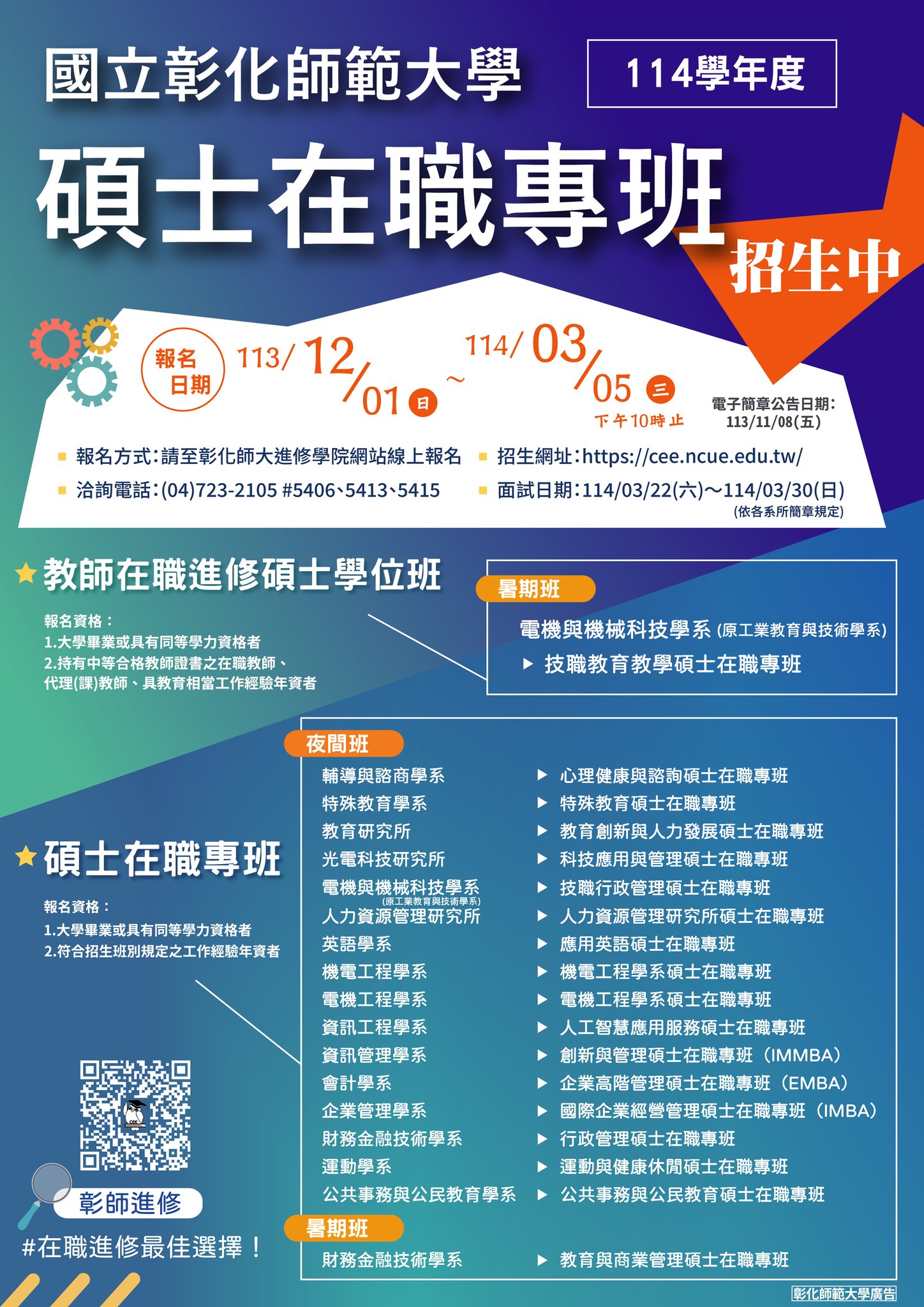 【轉知】彰化師範大學114學年碩士在職專班招生資訊