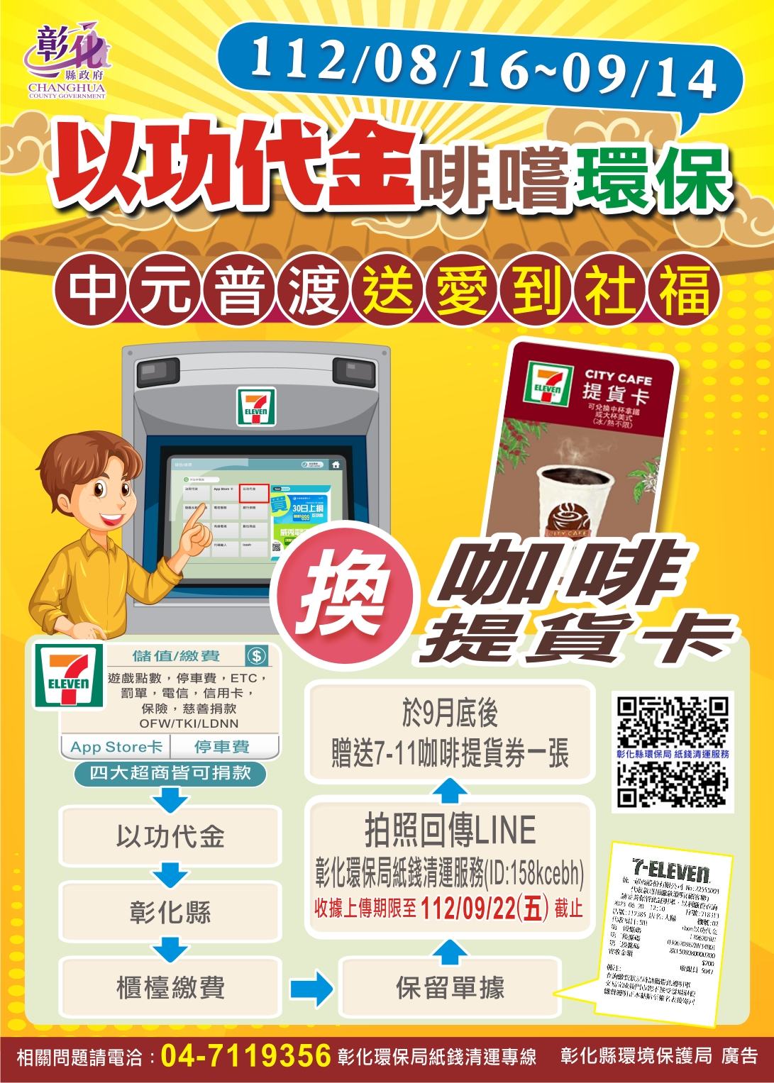 為響應2050淨零排放,今年首推「中元普渡送愛到社福 以功代金啡嚐環保」活動,請協助推廣於112年9月14日前至四大超商以功代金捐款並指定「彰化縣」社福團體即可憑捐款收據兌換咖啡,期以各界運用資源進行宣導以移風易俗,共同提昇民眾環保意識、維護本縣生活環境品質。